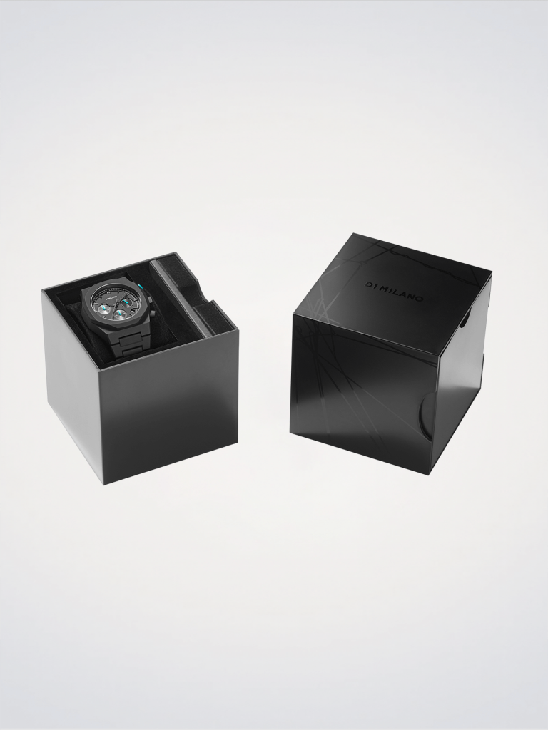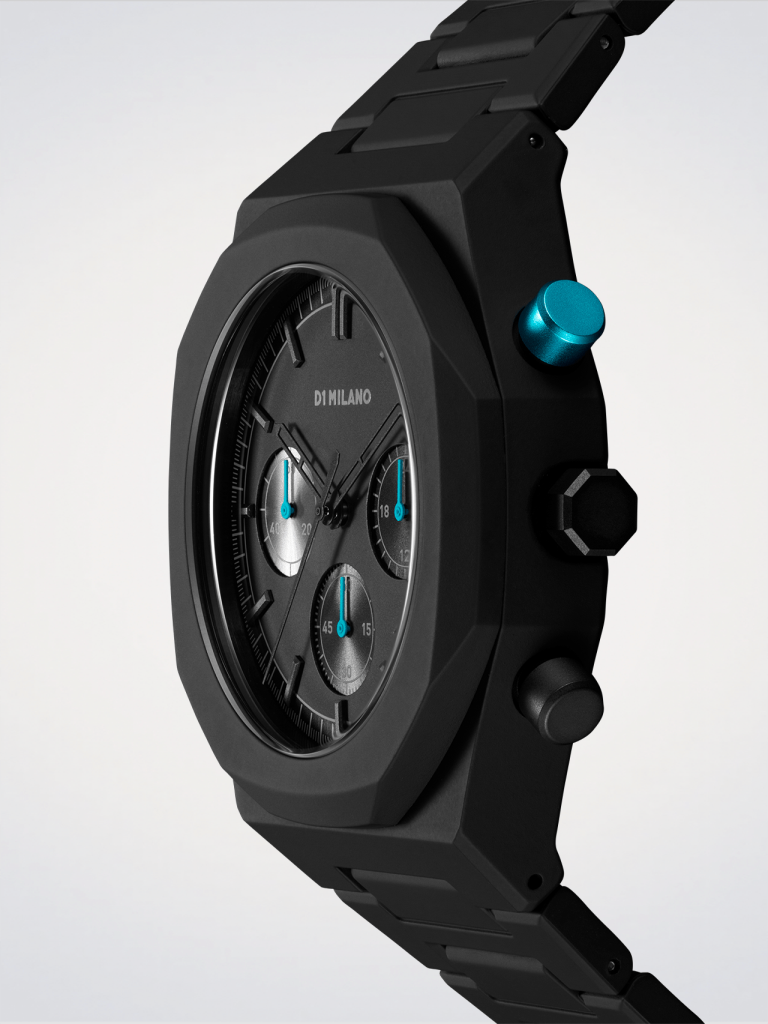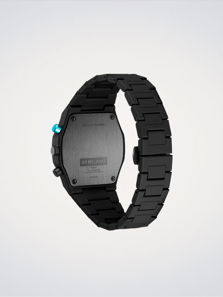 Il D1 Milano Polychrono Charcoal Black unisce l'iconica leggerezza alla funzionalità cronografica.