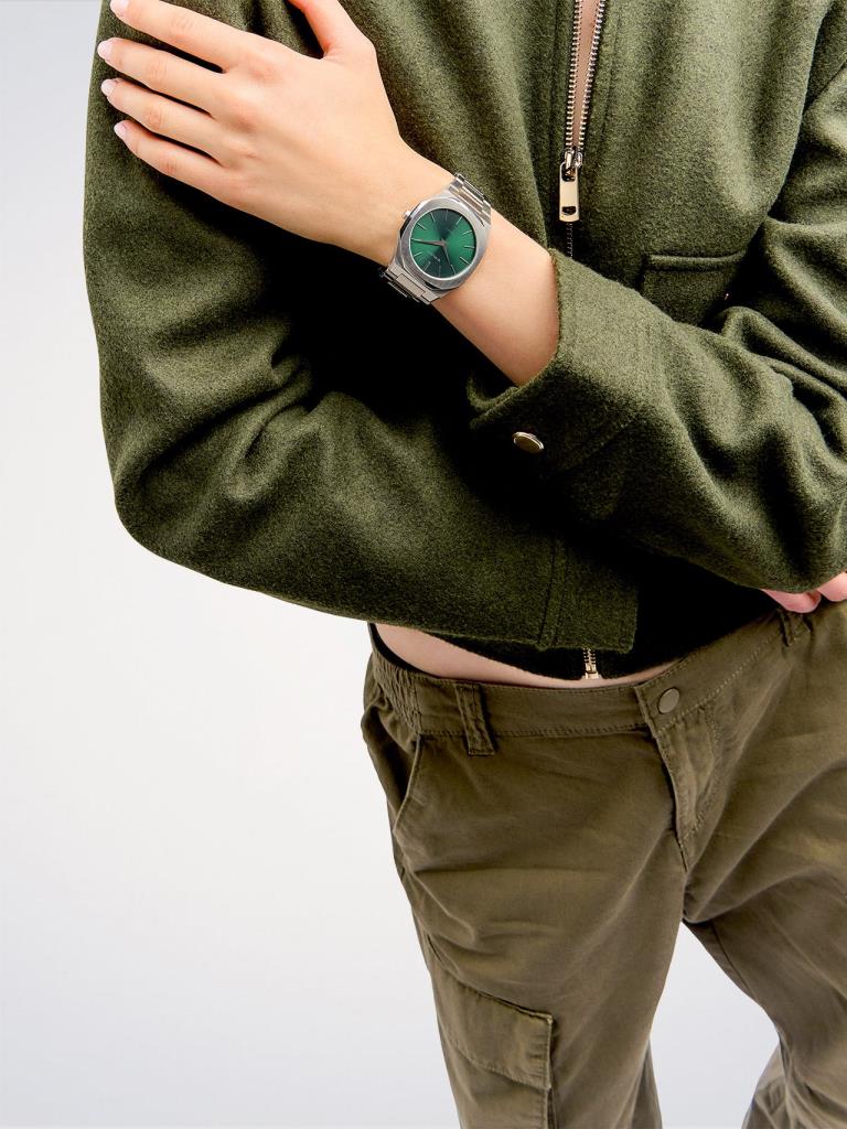 Il quadrante, dal colore Verde Scarabeo, cattura la luce in modo dinamico, creando un effetto cangiante e irresistibile. È un colore versatile, discreto e distintivo al tempo stesso.