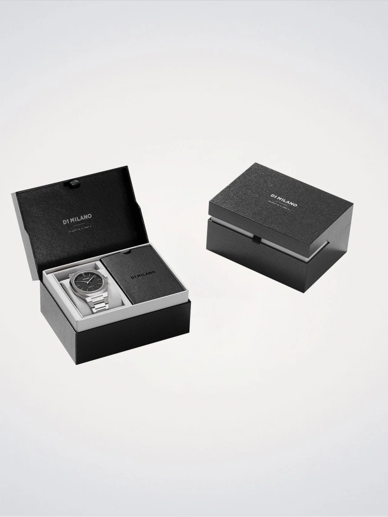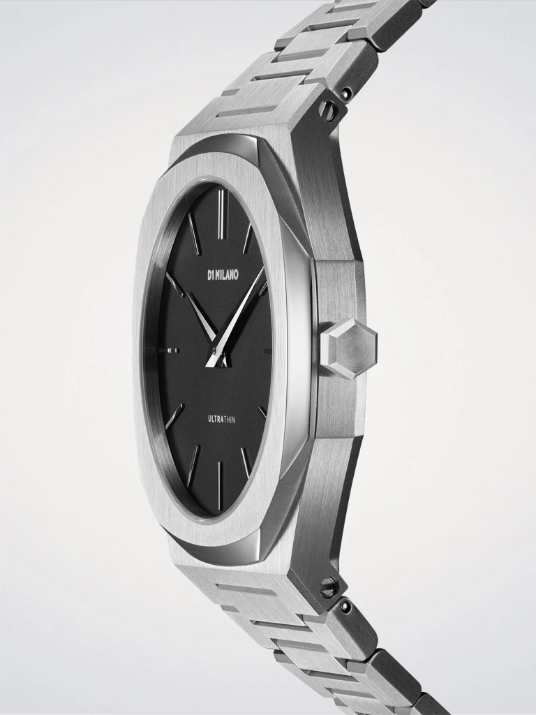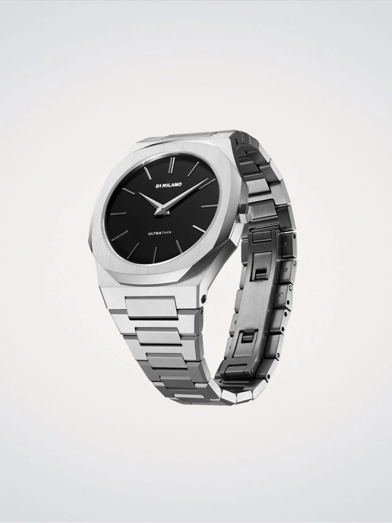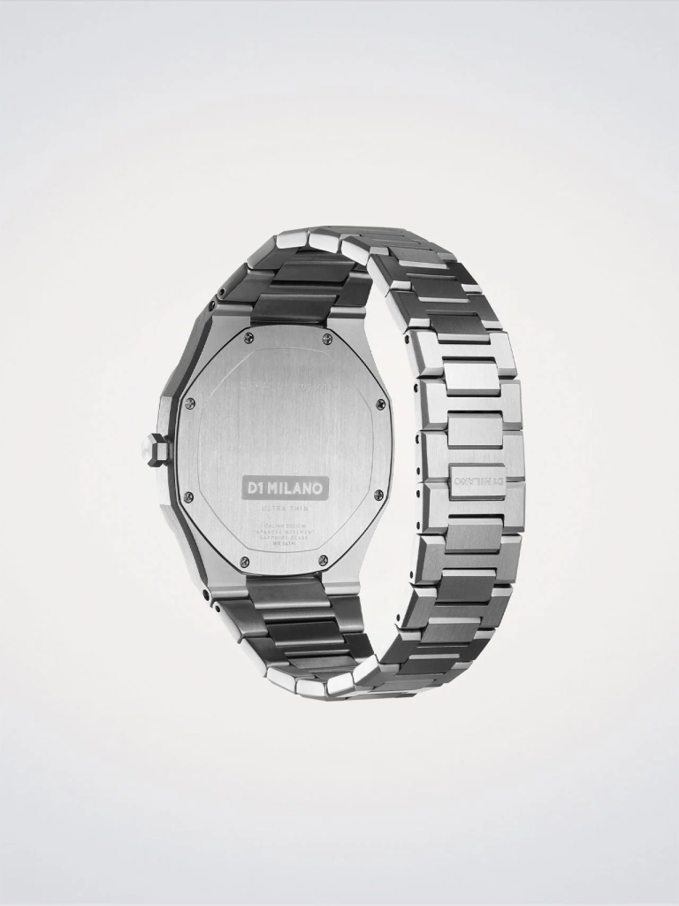 Il D1 Milano Ultra Thin Re-Silver è l'orologio essenziale che non passerà mai di moda: incarna l'eleganza nella sua forma più pura, combinando il design geometrico distintivo del brand.